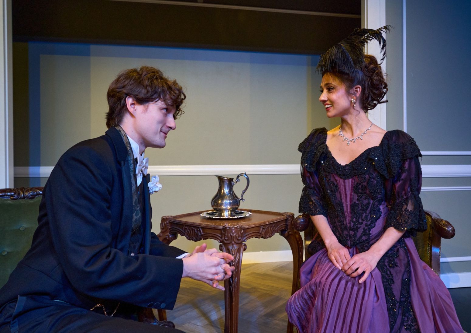 Over its well-mannered pace, the play frames the story of Sir Robert Chiltern (Jed Peterson), a self-made man of London Society, whose unfailing honor is the epitome of virtue in the eyes of his wife Gertrude (Madelyn Monaghan). However, Gertude’s ideal of Robert exceeds his own. In an era usurped by money, Robert, who “fought the century with its weapons and won,” ascends London’s social ladder with the genius of opportunity and ambition at all costs. All is prosperity and bliss for the Chilterns, until Gertrude’s schooldays rival, the scandal-addled Mrs. Chevely (Connie Castanzo) arrives from Vienna with a suspicious proposition for Robert.