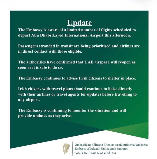 “We are maintaining close touch with the airlines of those citizens who were in transit when the conflict began. We also remain in very close contact with EU partners as this situation evolves.”