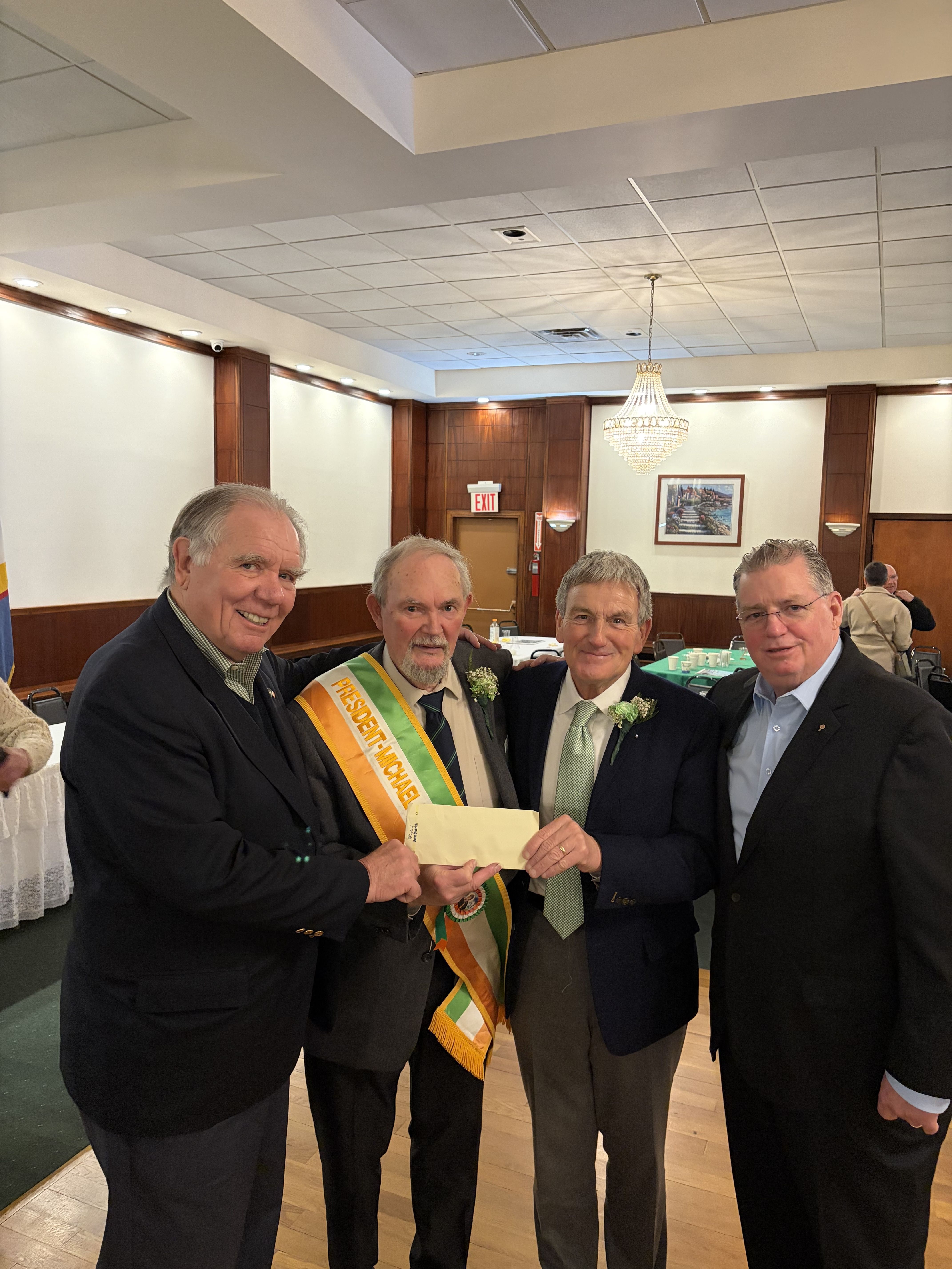 Knights of Saint Patrick members, including Chairman John F. Tully, Patrick McGowan (2010 Grand Marshal, Queens County Saint Patrick’s Day Parade), and Brian J. Sharkey, presented the donation to Parade Chairman Michael A. Benn (2025 Grand Marshal ,NYC Saint Patrick’s Day Parade) at the Rockaway Beach Knights of Columbus hall.