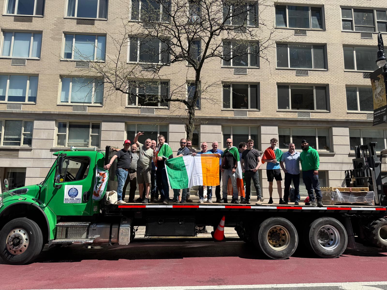 The group of contractors and workers banded together in a team called “The Irish Construction Convoy NYC” marshalled 37 vehicles bedecked in Tricolors and signs reading “We Support Irish Truckers, Farmers, and the People of Ireland” and caravanned down 5th Ave in Manhattan from E 86th St. to E 23rd St.